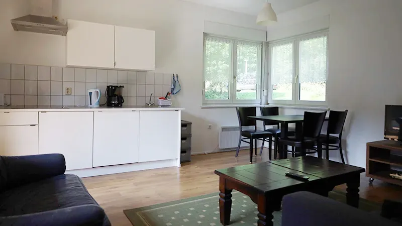 Für zwei bis vier Personen – ideal für Paare, kleine Familien oder Freunde Durch den Eingangsbereich mit drei Türen erreichen Sie direkt Bad, Schlafzimmer und Wohnzimmer mit offener Küche.